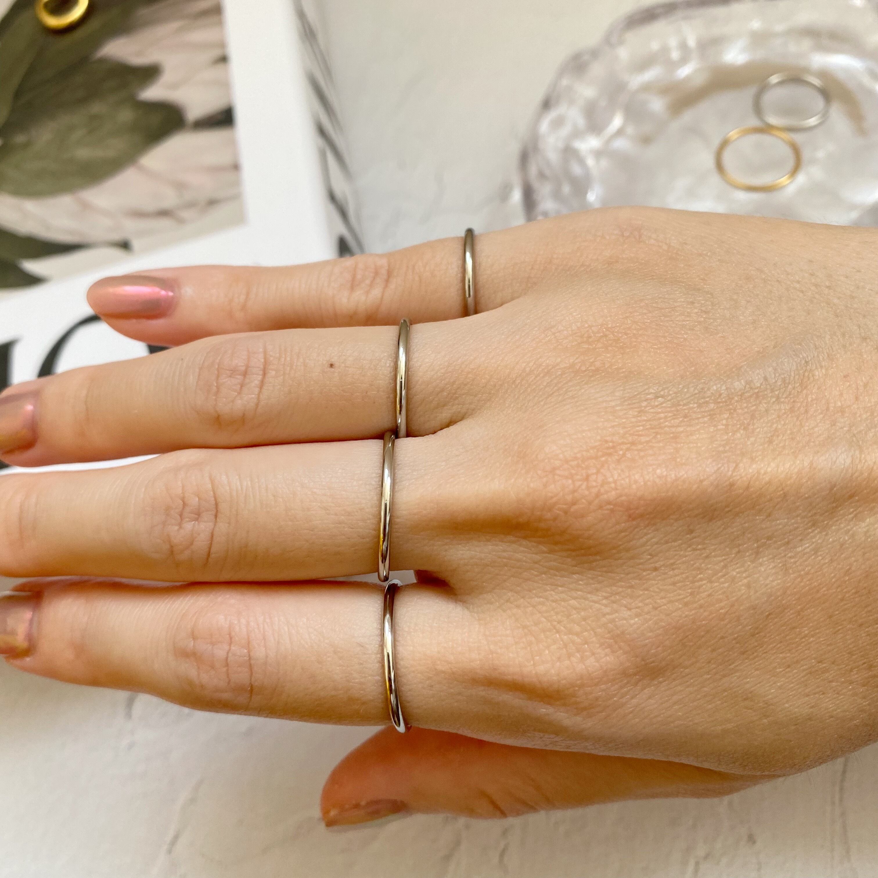 1.4mmのシンプルなリングです。いくつかつけたり、他の指輪とのコーディネートも楽しめます。
