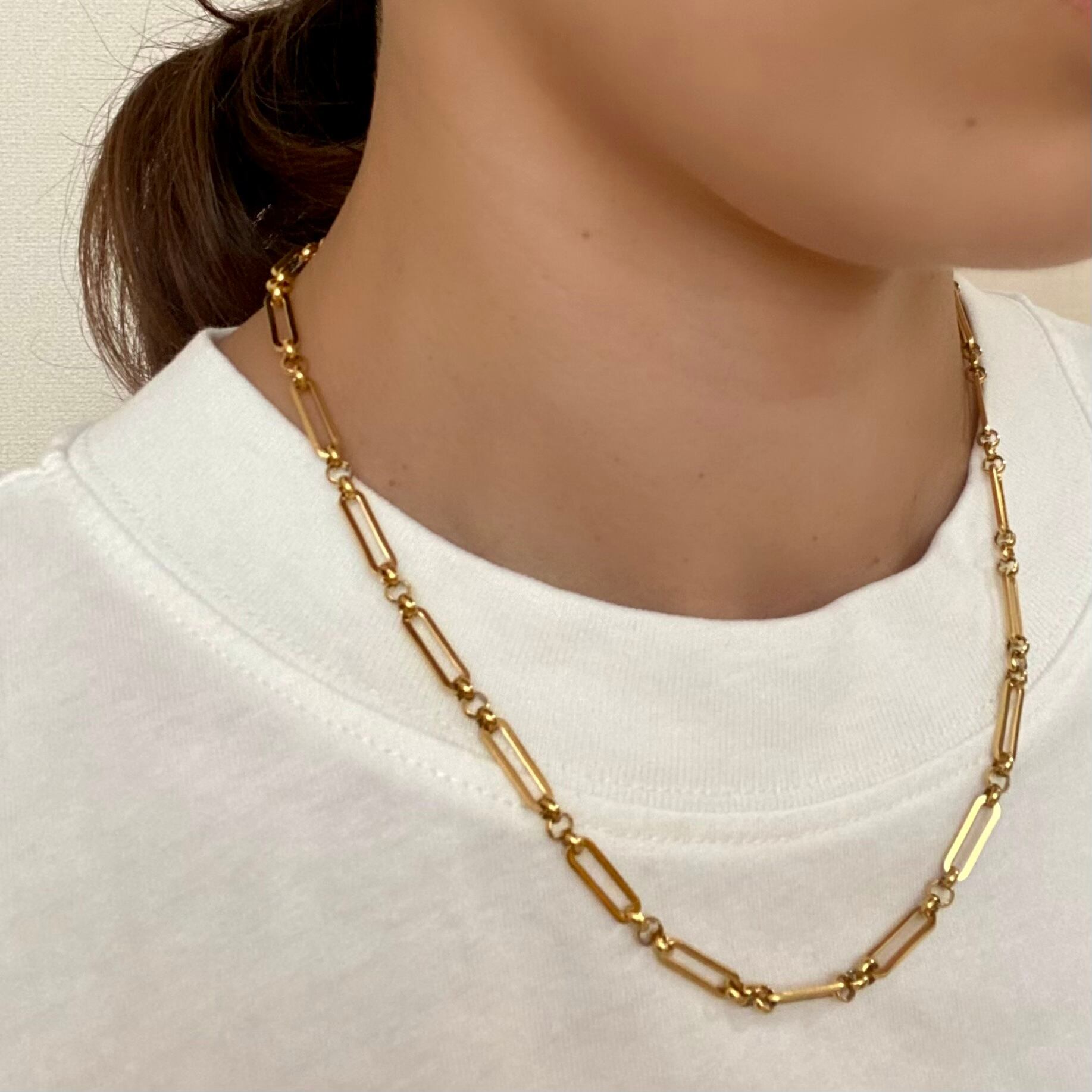 これひとつでお洋服のアクセントになるチェーンネックレスです。長さが45cmで長めなので、秋冬はタートルネックの上にもつけられます。