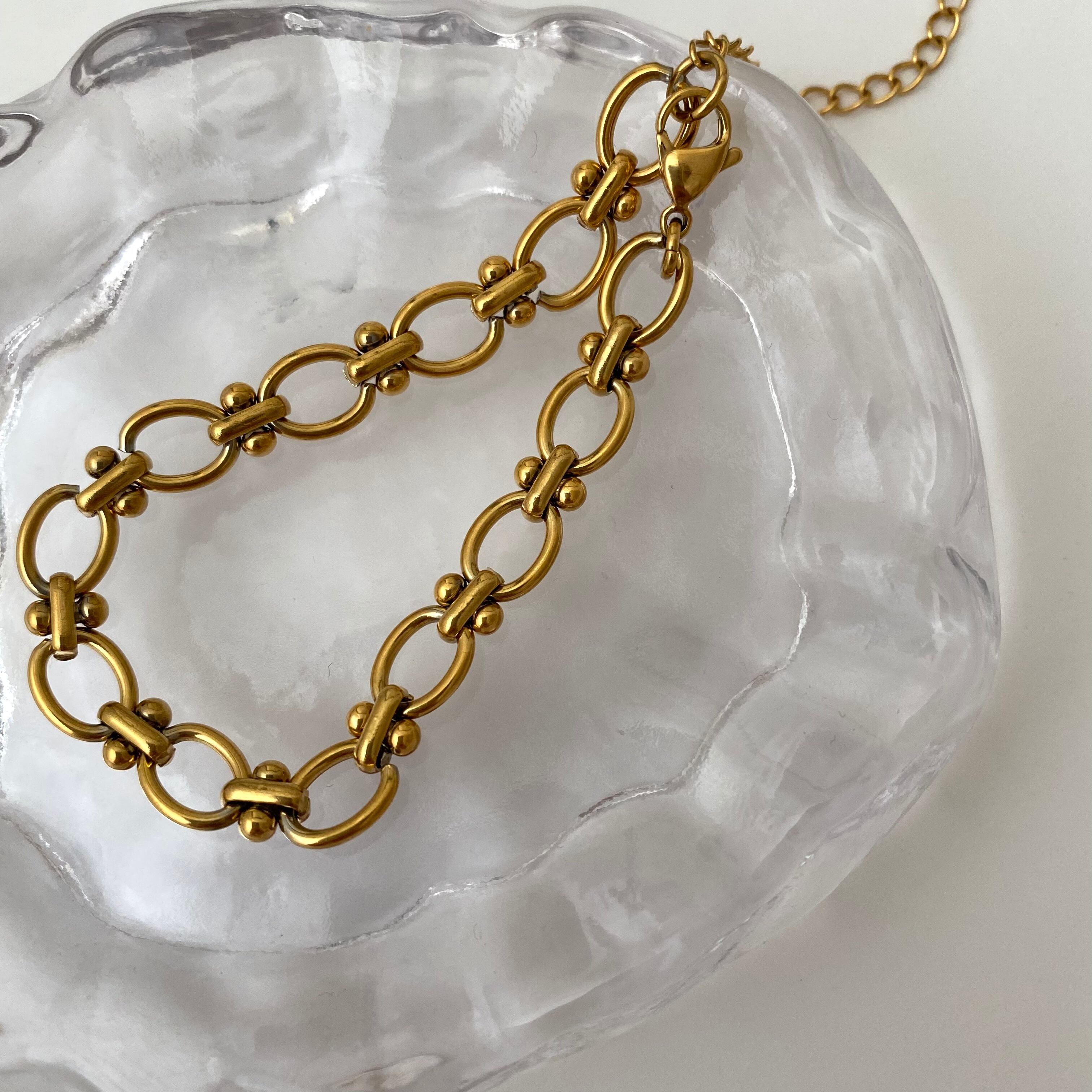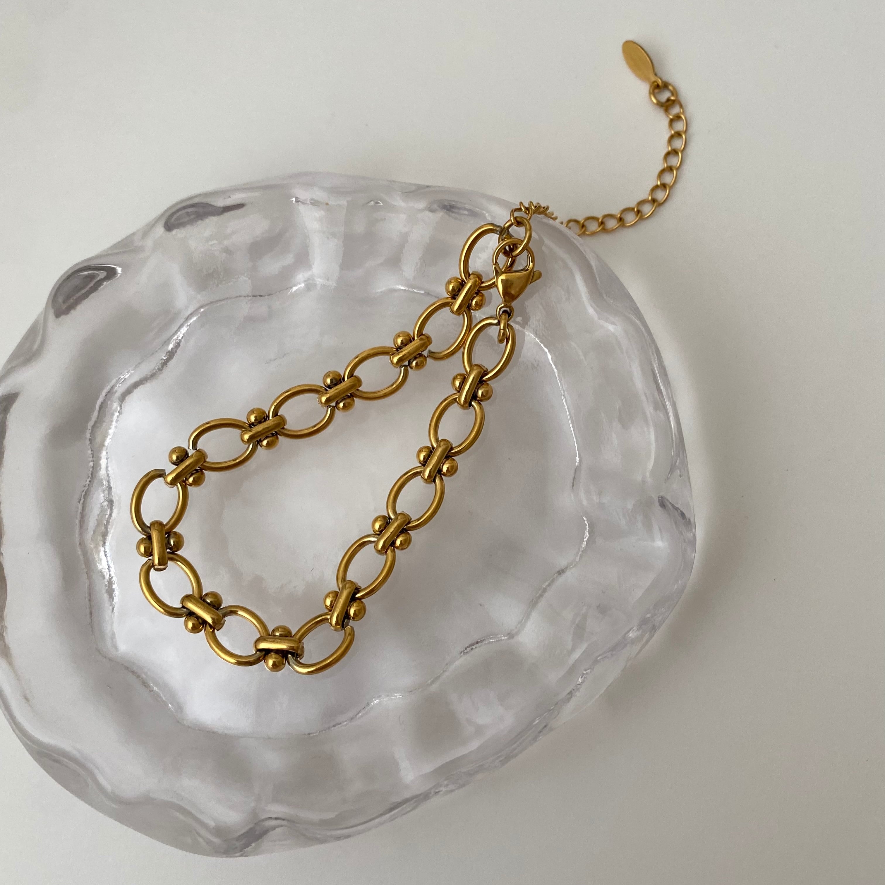 存在感がありながらも女性らしい雰囲気のチェーンブレスレットです。
